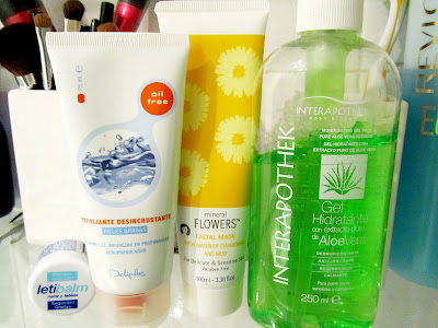 - Aquí os dejo otra foto de mis básicos de cosmética y cuidados personales. En primer lugar el Bálsamo reparador Letibalm. Yo me lo aplico todas las noches en los labios para hidratarlos y lo llevo siempre en el bolso para lo mismo, sobretodo en invierno que hace mucho frió y los labios se agrietan y secan; En segundo lugar, el Exfoliante Desincrustante para Pieles Grasas Oil Free de Deliplus (Mercadona). He de deciros que aunque no salga en la foto porque lo adquirí después también tengo el fluido hidratante y la mascarilla equilibrante Oil Free de la misma linea de productos Deliplus. Es económico, al alcance de todo el mundo y a mi personalmente me va genial... también es verdad que yo soy muy "patosa" en los productos para la cara, pero es que siempre que he probado cremas hidratante de nivea... garnier ...etc, nunca me han ido del todo bien!! Pero bueno para gusto los colores, no¿?; En tercer lugar, la Mascarilla facial a base de agua y camomila para pieles sensibles y delicadas de Sephora. La utilizo dos veces por semana, como se utilizan todas las mascarillas supongo, y si tengo alguna rojez me la elimina al momento..bueno al momento no.. después de llevarla 10-15 min. y retirarla con agua templada! Me va muy bien :); Y en cuarto y ultimo lugar, Gel Hidratante con extracto de Aloe Vera de Interapothek. Os recomiendo siempre que si podáis, lo utilices natural, es decir, cortado de la planta si podéis tener alguna en casa, ya que es mas efectivo y tiene los nutrientes mas frescos. Si no, siempre es bueno tener algún gel o hidratante con extracto de Aloe Vera ya que es una planta dermohidratante, anti-irritante, regenera y calma las pieles sensibles o castigadas.