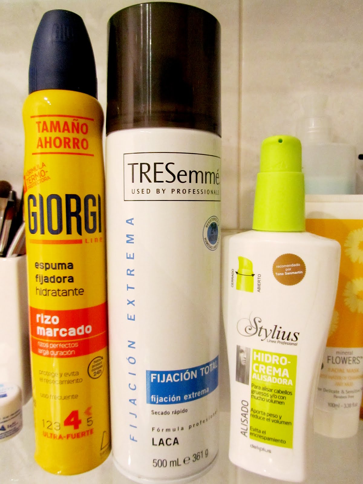 - Estos son otros de mis tres productos que nunca me faltan: Espuma fijadora hidratante de Giorgi para marcar el rizo natural de mi pelo, Laca Tresemmé fijación extrema, y Hidrocrema alisadora de Stylius linea profesional de Deliplus (Mercadona). En primer lugar la, la espuma fijadora me la aplico siempre con el pelo secado con la toalla y cuando ya voy a secarlo con el secador o al aire, aunque también la aplico a veces cuando me hago rizos en el pelo con la plancha para dar un poco de volumen y fijación. Se utiliza para proporcionar unos rizos de larga duración suaves y brillantes; En segundo lugar, la Laca Tresemmé fijación extrema la utilizo siempre para mi acabo final. Llevo utilizando esta laca... un año y medio me parece y es la que mejor me va. La utilizo tanto como para cuando me hago coletas altar y estiro el pelo, como para cuando me lo rizo y fijar mas aun el rizo pero siempre con movimiento. Para ello, unas veces me aplico mas o menos cantidad de producto.