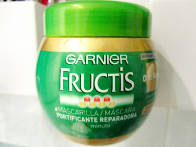 - Mi mascarilla!! Esta concretamente es la Mascarilla Fructis de Garnier Oleo Repair, esta compuesta de un gran concentrado de activo de frutas y esta indicada para cabellos secos y/o dañados. Os comento, yo la utilizaba con el champú de la misma linea de Garnier, y me iba genial solo que al no tener el cabello extremadamente seco me lo engrasaba un poquito y al dia siguiente ya tenia el pelo sucio!! Pero por lo demas me hidrata muchisimo las puntos, me deja el cabello super suave y muy suelto, le da mucho brillo y tiene un olor que da hambre!! Estoy muy contenta con ella y ya llevo varios meses utilizandola, aunque supongo que ire probando otras.. Por si encuentro alguna que me vaya perfecta! :)