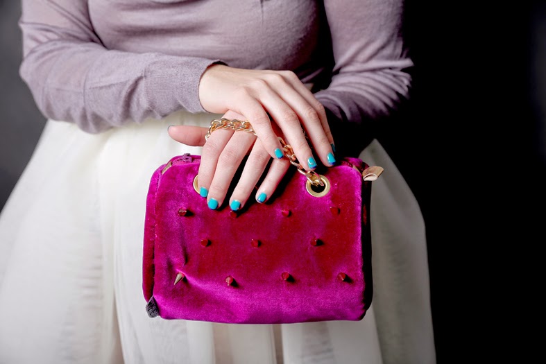 Diseñadora de moda y complementos. Como veis, luzco en la foto una preciosa falda de tul blanco que forma parte del vestido de novia de su coleccion. Y además, unos de sus diseños mas característico de su marca (PEYRES), este bolso de terciopelo con detalles en dorado que es precioso.