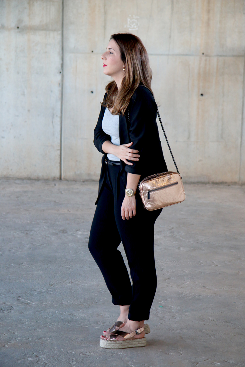 Así que imaginaos lo feliz que estaba con mi "traje de chaqueta". Como veis, estrené el bolso de Zara y las famosas sandalias-plataforma de Stradivarius, que igual, combinan a la perfección con ese color rosa metalizado que tienen.