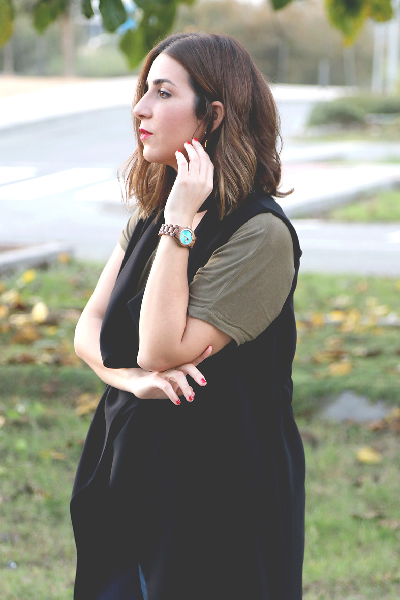 Como ya os conté en este post (aquí) se trata de un reloj de madera simplemente: PRECIOSO. Que ademas, veo muy posible para cualquier estación del año. Esta vez, aprovechando que hacia un poco de mejor tiempo en Murcia, opte por combinarlo con unos jeans y una camiseta básica, y dar un toque mas formal con este chaleco de Zara que podéis ver aquí. Un look muy básico y cómodo, aunque ahora que hace mas frío... Necesito algo mas de abrigo jajaja.