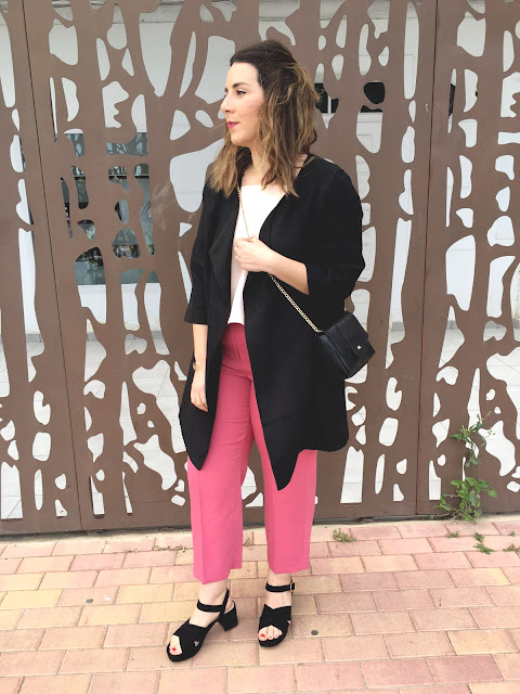 Todas las prendas las compré por separado sin pensar para nada en como las combinaría (sobre todo los pantalones rosa) pero al final el resultado me encanta. La mezcla del negro y el rosa se ha convertido en uno de mis favoritos: es elegante pero primaveral, estiliza pero es vistoso y, ademas, perfecto para este tipo de celebraciones intermedias y formales que tanto nos traen de cabeza!