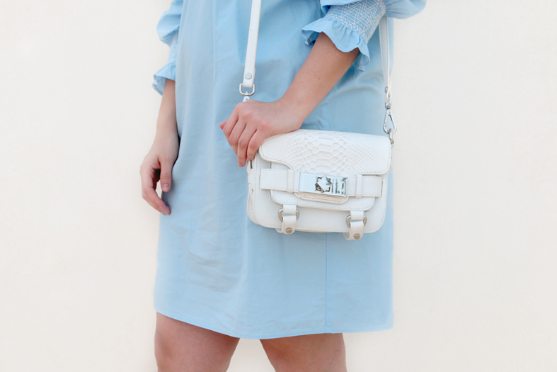 Lo complementé con este bolso blanco y unas sandalias joya en tonos grises/plata que creo que son los colores que mejor pueden combinar con el azul. Y para darle un toque más especial opté por esta banda (que podéis encontrar ahora en las rebajas) y que se puede usar de muchas maneras: para el pelo, en el cuelo, en la muñeca, adornando el bolso... ¡Muy ponible!