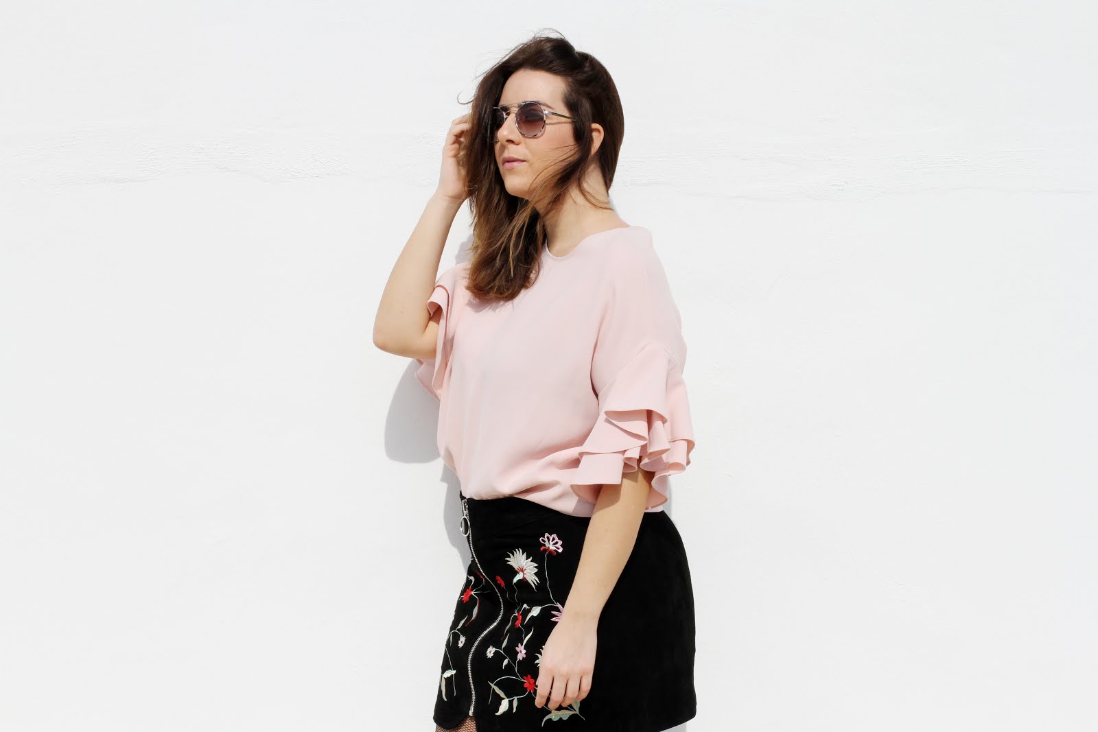 ¡Hola chicas! Hoy os traigo un post de rosa nude. El rosa es mucha tendencia esta temporada así que este look os va a encantar. Aposté por un top con volantes y una falda de cuero negra con bordados, podríamos decir que llevo 3 tendencias en una.