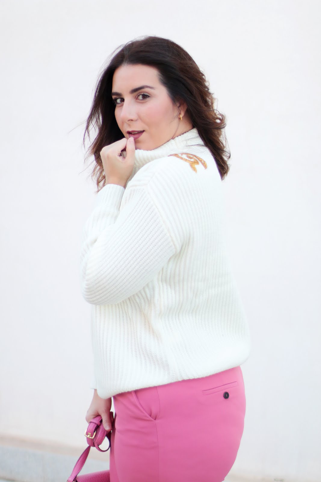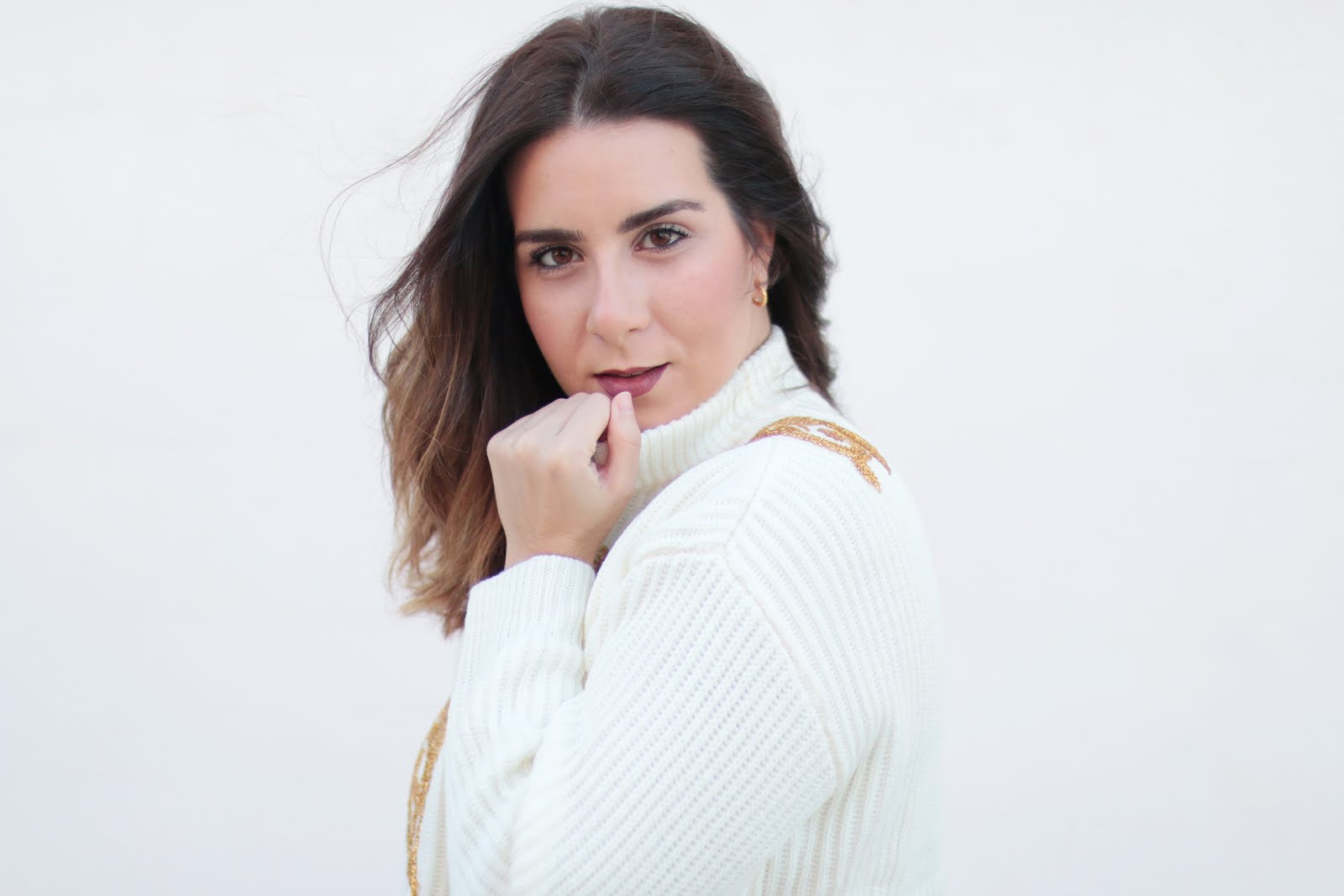 Yo quería un jersey en blanco y este me ha encantado. Los detalles de los laterales en dorado creo que le hacen bastante elegante que, además, nos da posibilidades de combinar tanto para el día como para la noche. En este caso con un salón, pero podemos combinarlo con unos jeans y unas zapatillas en colores camel para darle este toque sport.